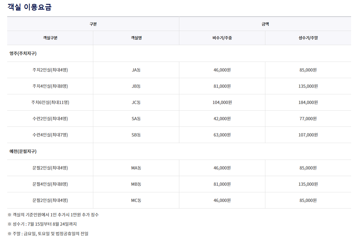 이용요금 : 최저 2인실 46,000원부터 6인실 184,000원까지 다양합니다.