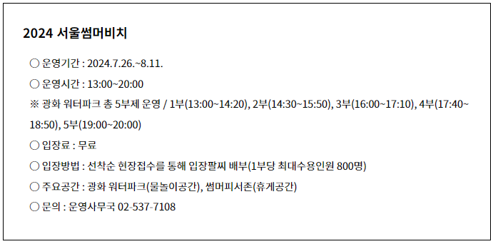 2024 여름방학 시즌을 맞아 광화문광장에 물놀이장이 설치됩니다. 작년보다 2배 규모로 확대되었고, 물놀이장인 '광화 워터파크'존과 무더위를 피해 쉴 수 있는 휴게공간 '썸머피서존'으로 운영됩니다. 1일 5부제 운영이고 1부는 13:00부터 시작됩니다. 1부 당 800명, 1일 최대 인원 4,000명 기준으로 운영하고 현장에서 선착순으로 팔찌를 배부합니다.