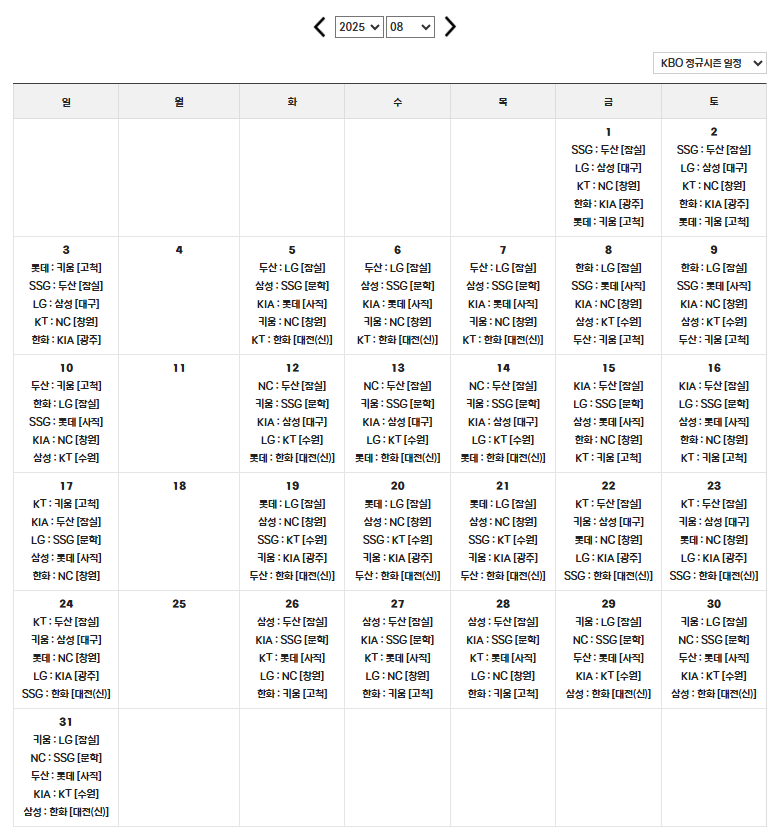 2025 프로야구 정규리그 8월 일정표